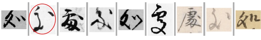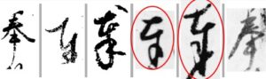 冒頭が1文字か2文字か悩ましい。書き出しのひらがなの「を」ような筆運びに見覚えがあるので探してみると、タイトル冒頭の「奉」と似ている。「電子くずし字字典データベース」で「奉」を検索すると、以下のようなリストが表示された。やっぱり「奉」である。